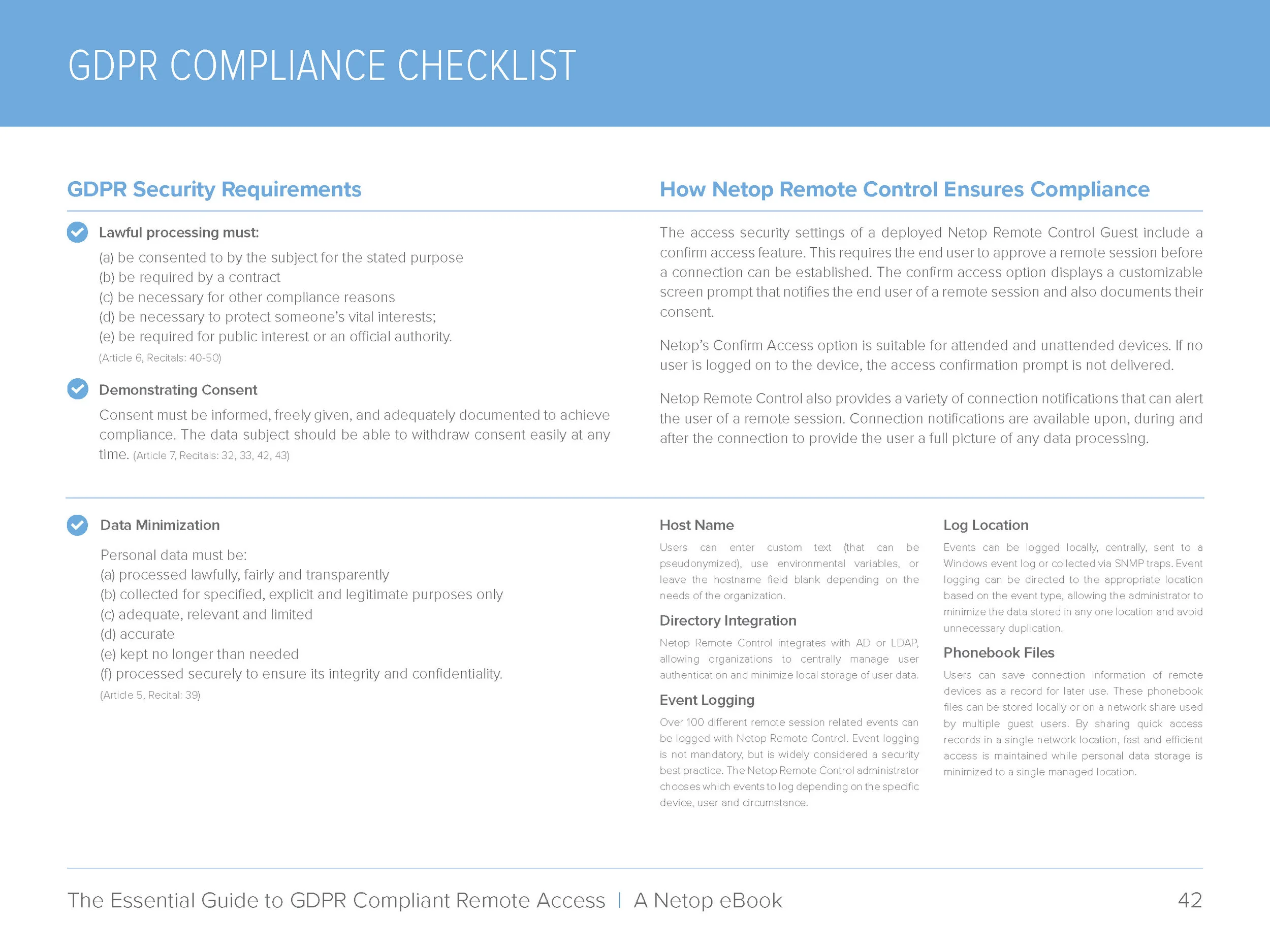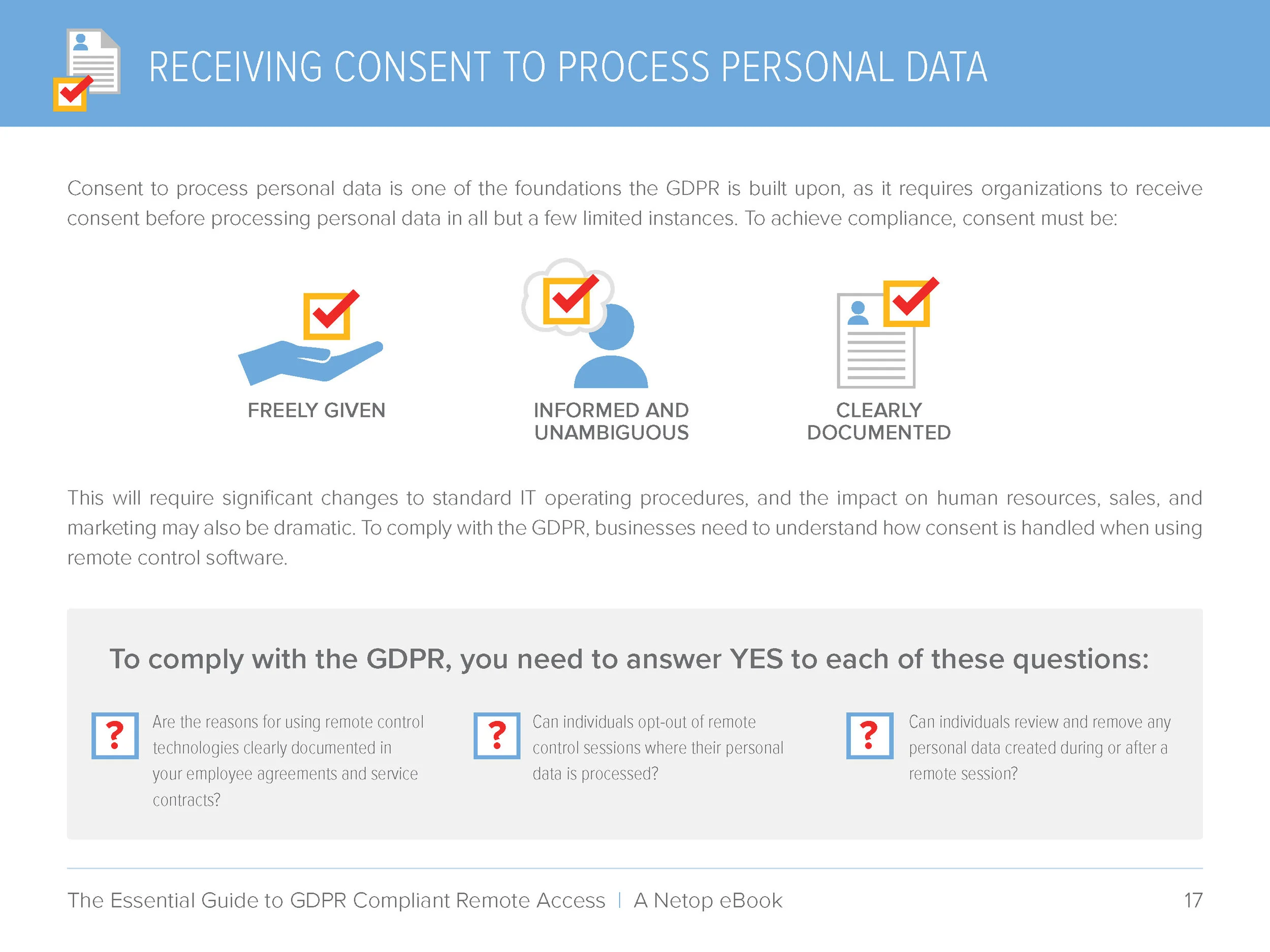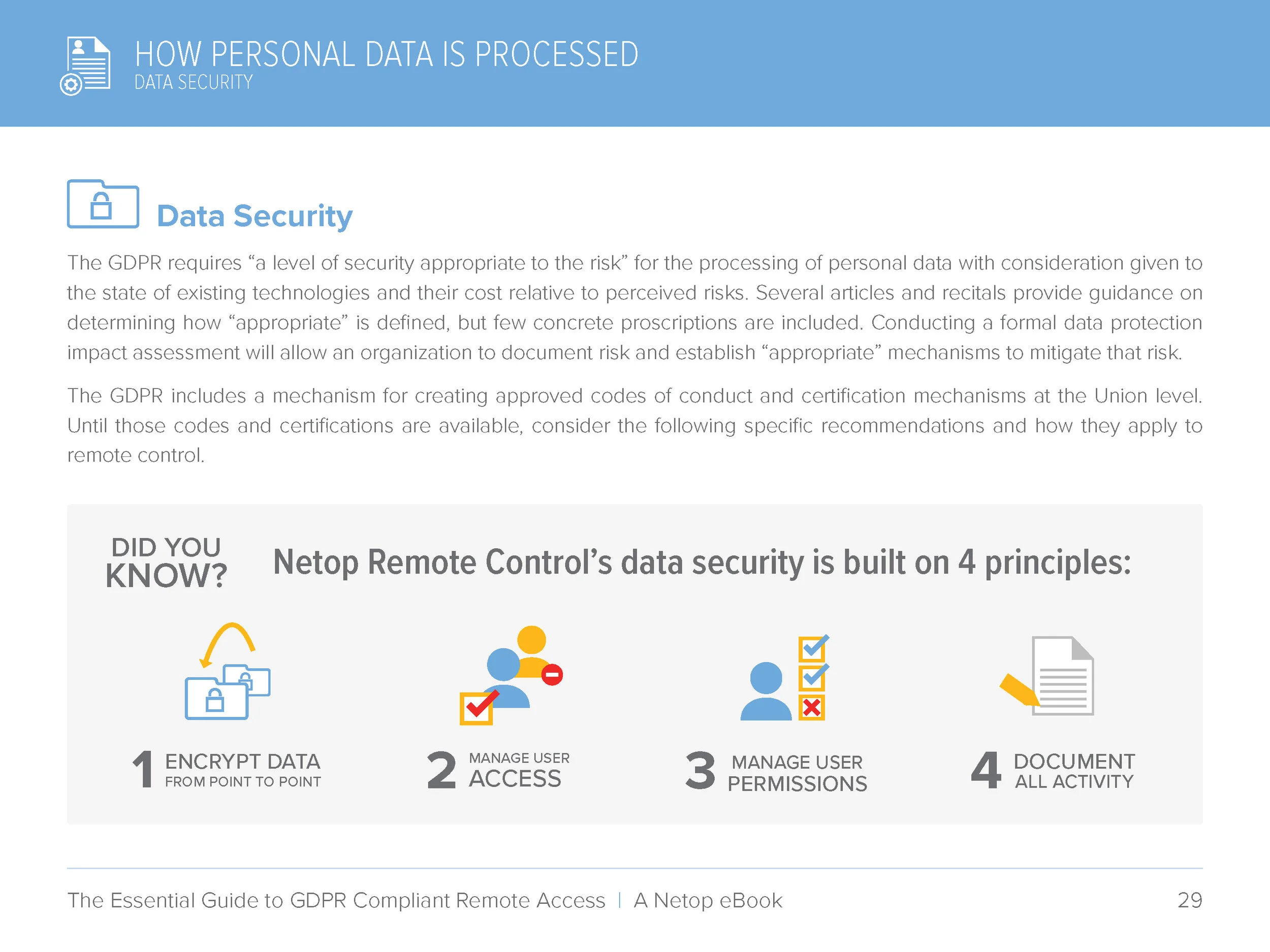 The following are select pages from The Essential Guide to GDPR Compliant Remote Access E-book, which Netop published in the weeks before the GDPR went into effect in Europe. I designed the layout and created the illustrations to make the General Data Protection Regulation easier to understand for the readers, as it's a pretty dry and dense subject.